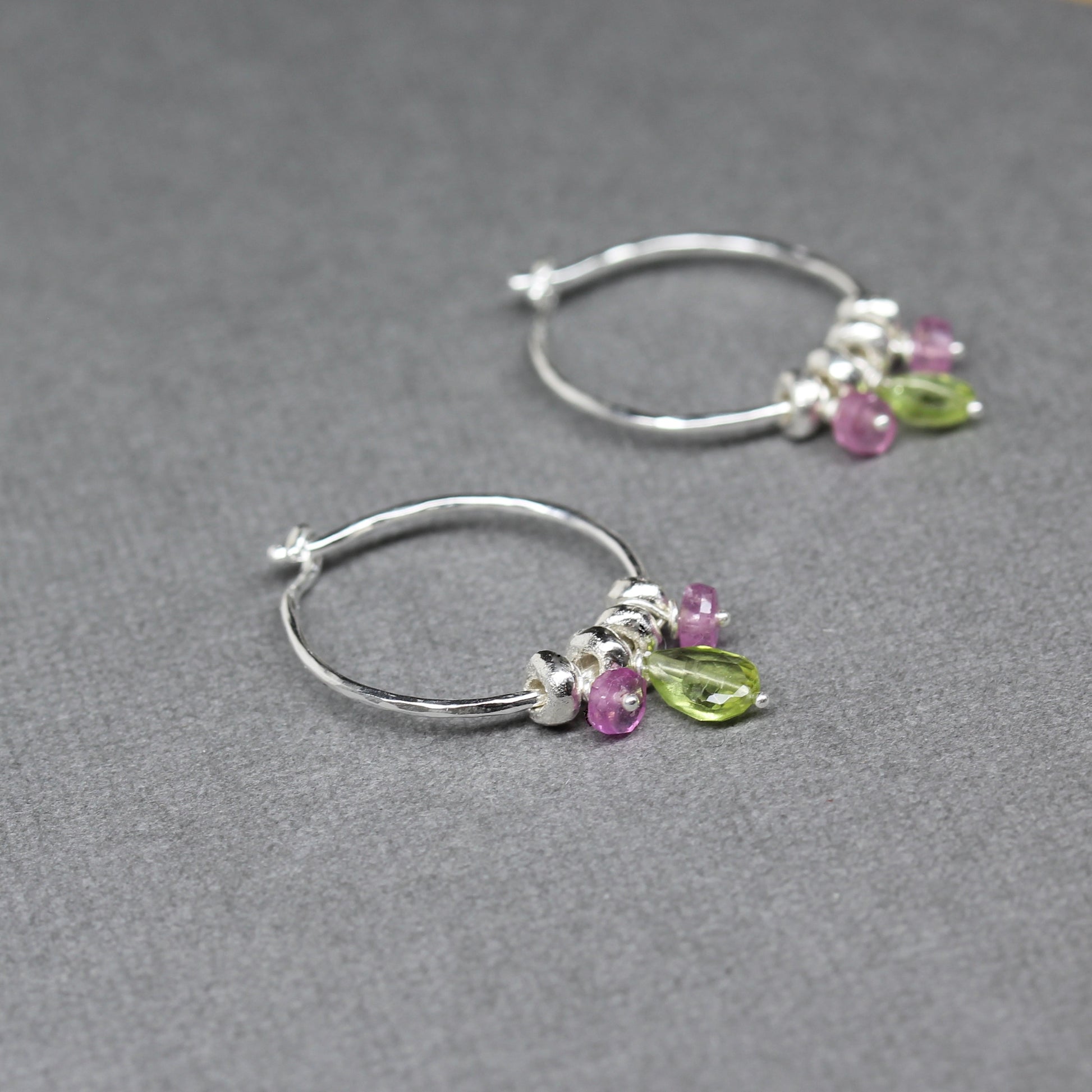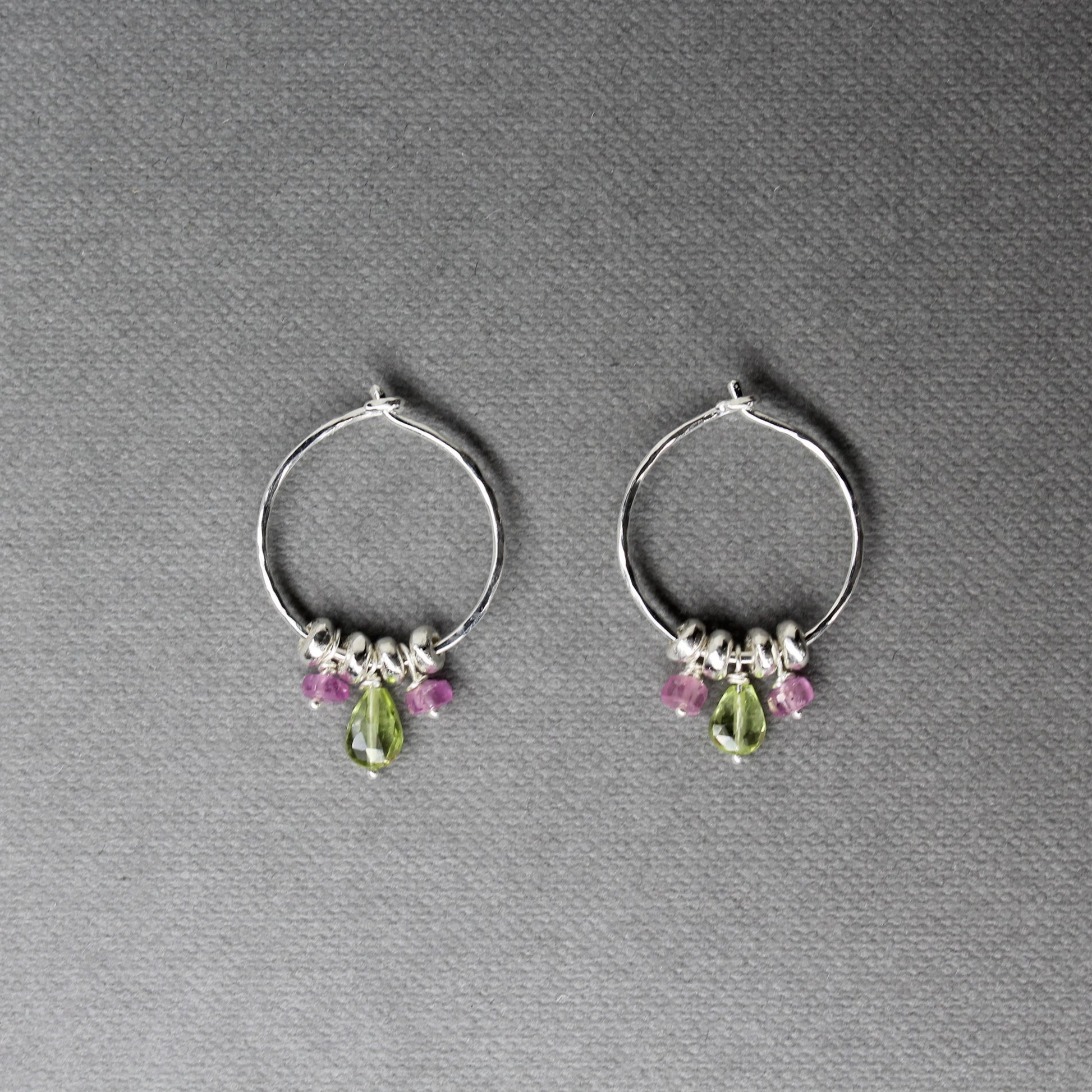 Sterling silver hoops with faceted Pink Sapphire and Peridot beads interspersed with handmade silver beads. These delicate hoops have been lightly hammered.